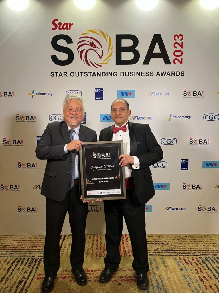 KINGOYA was recently awarded with a Certificate of Merit at the 2023 SOBA Awards Organised by the Star Newspaper. The Awards are intended to acknowledge effort made by members of the business community to improve their respective industries through exceptional branding and product innovations initiatives. Mr Yama Yeo and Gopi Nath Nair were pleased to receive the Certificate of Merit on behalf of KINGOYA.